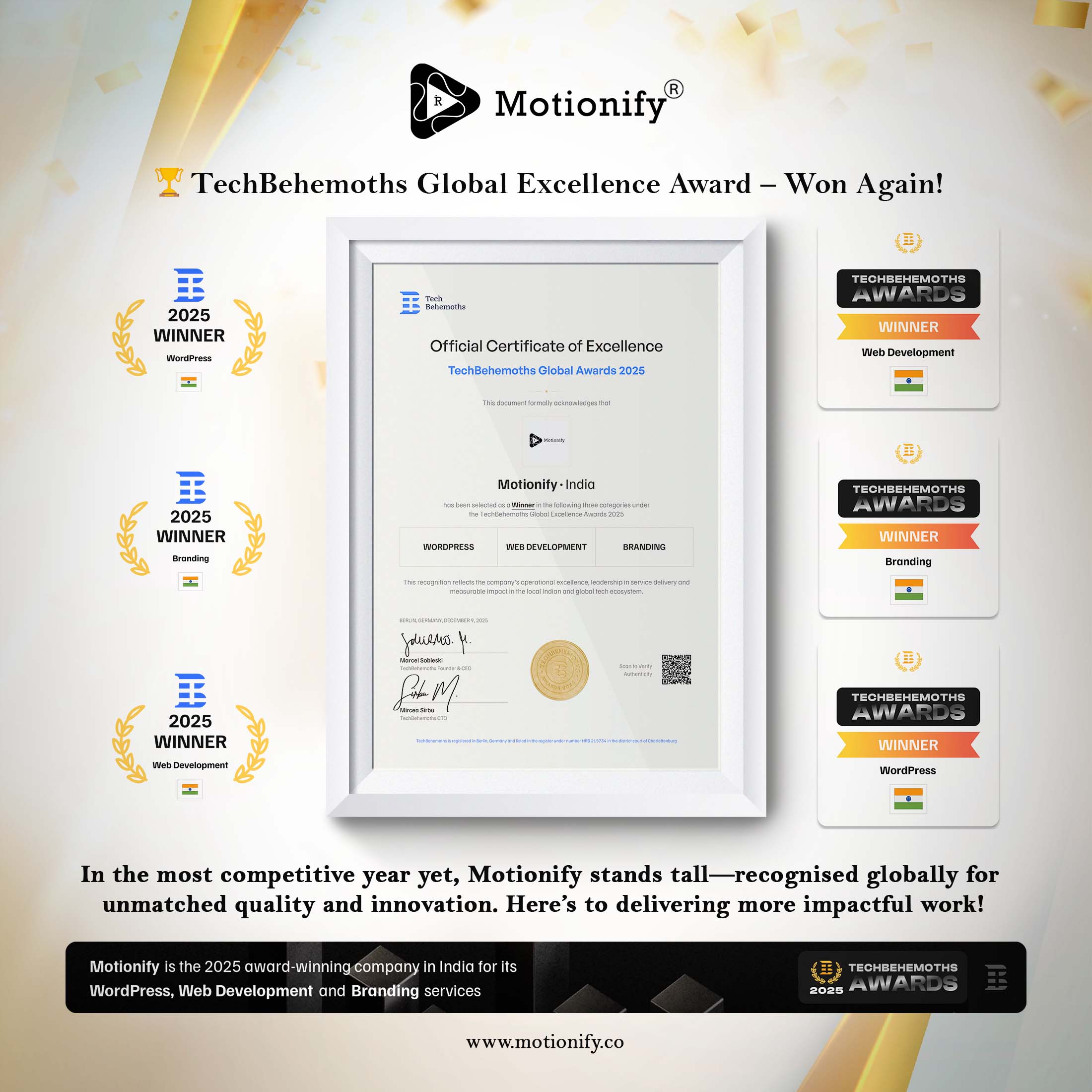 Motionify, a leading creative and digital solutions agency in India, has once again secured global recognition by winning the 2025 TechBehemoths Global Excellence Award. This achievement marks our second consecutive win, reinforcing our reputation as a top-performing agency in WordPress development, web development, and branding services.